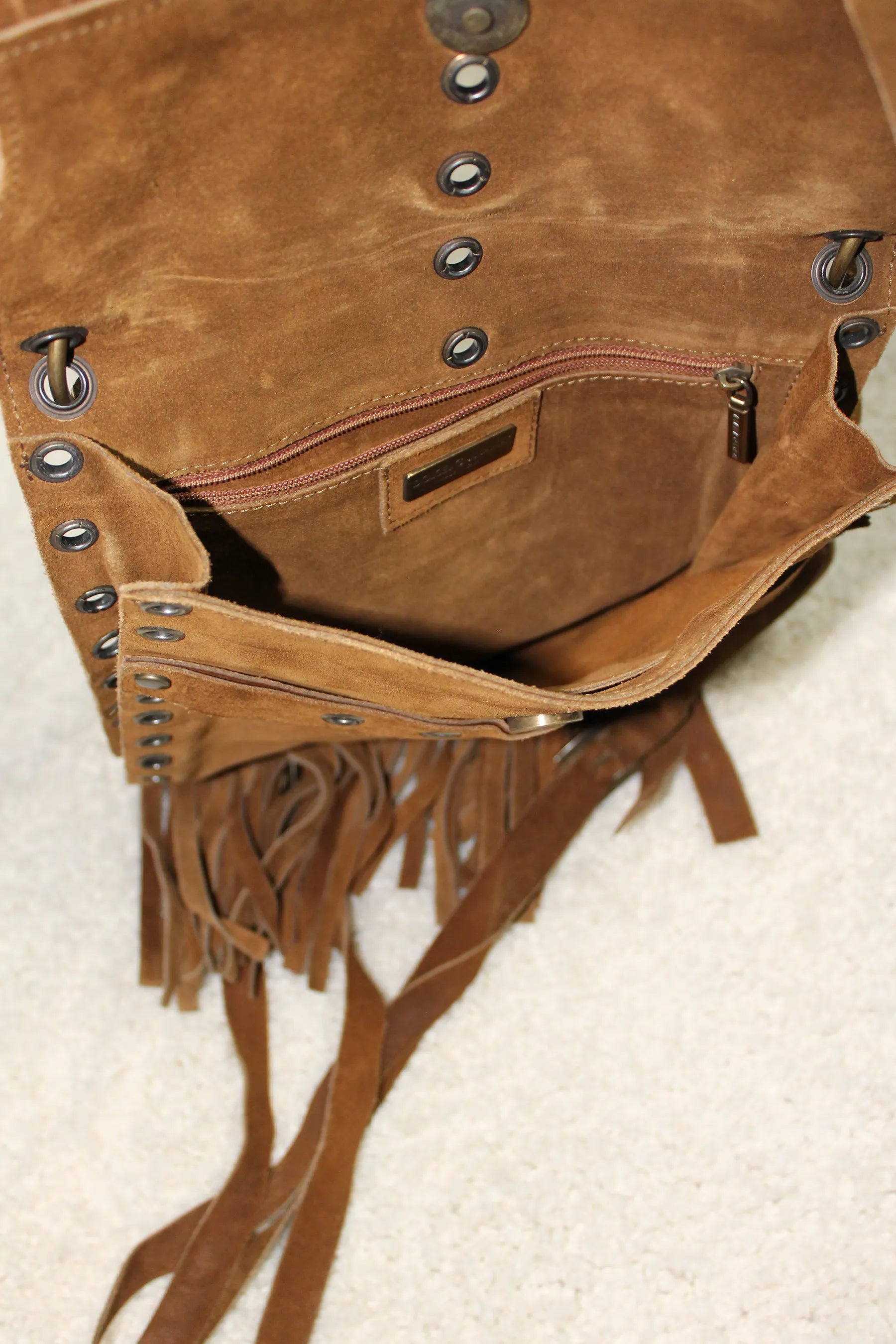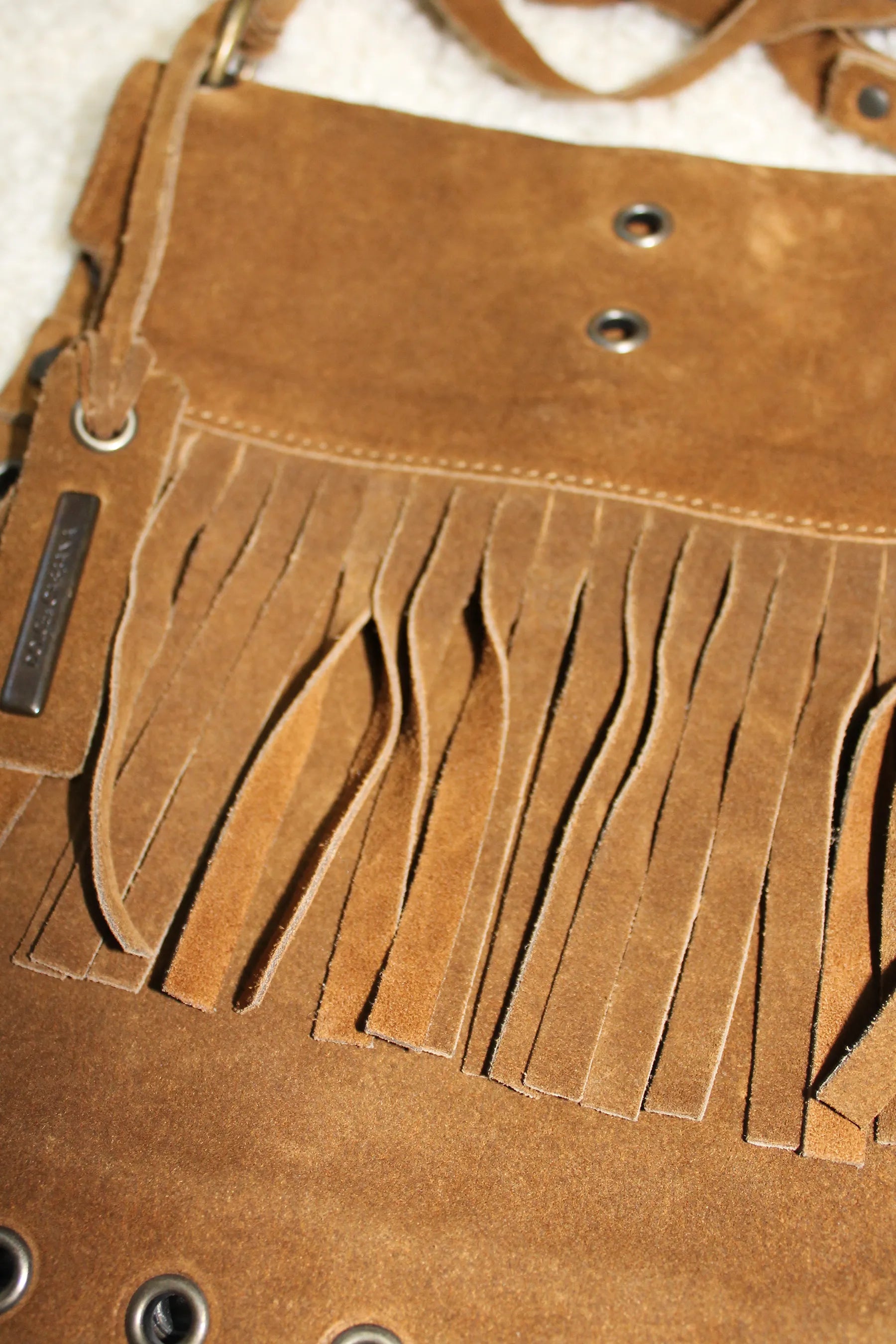 Iconica, dalla sfilata fall 2001 di Dolce & Gabbana, borsa in suede cognac, perfetta da portare anche come pouch bag a mano. Tracolla regolabile con fibbie, chiusura con bottone a pressione, tasca interna con zip.