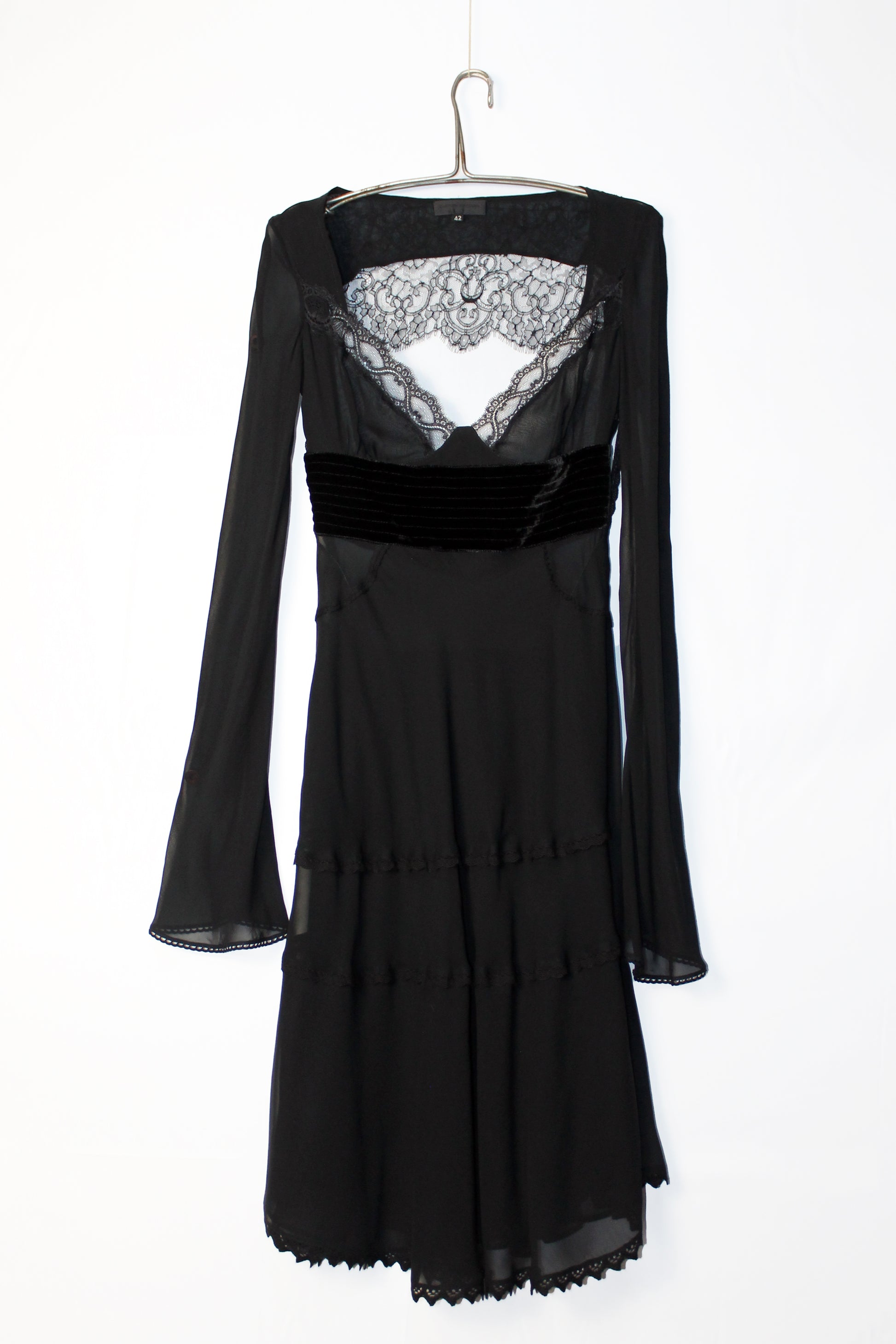 Slip dress nero a maniche lunghe in chiffon di seta, con inserto a fascia in vita in velluto e dettagli in pizzo.