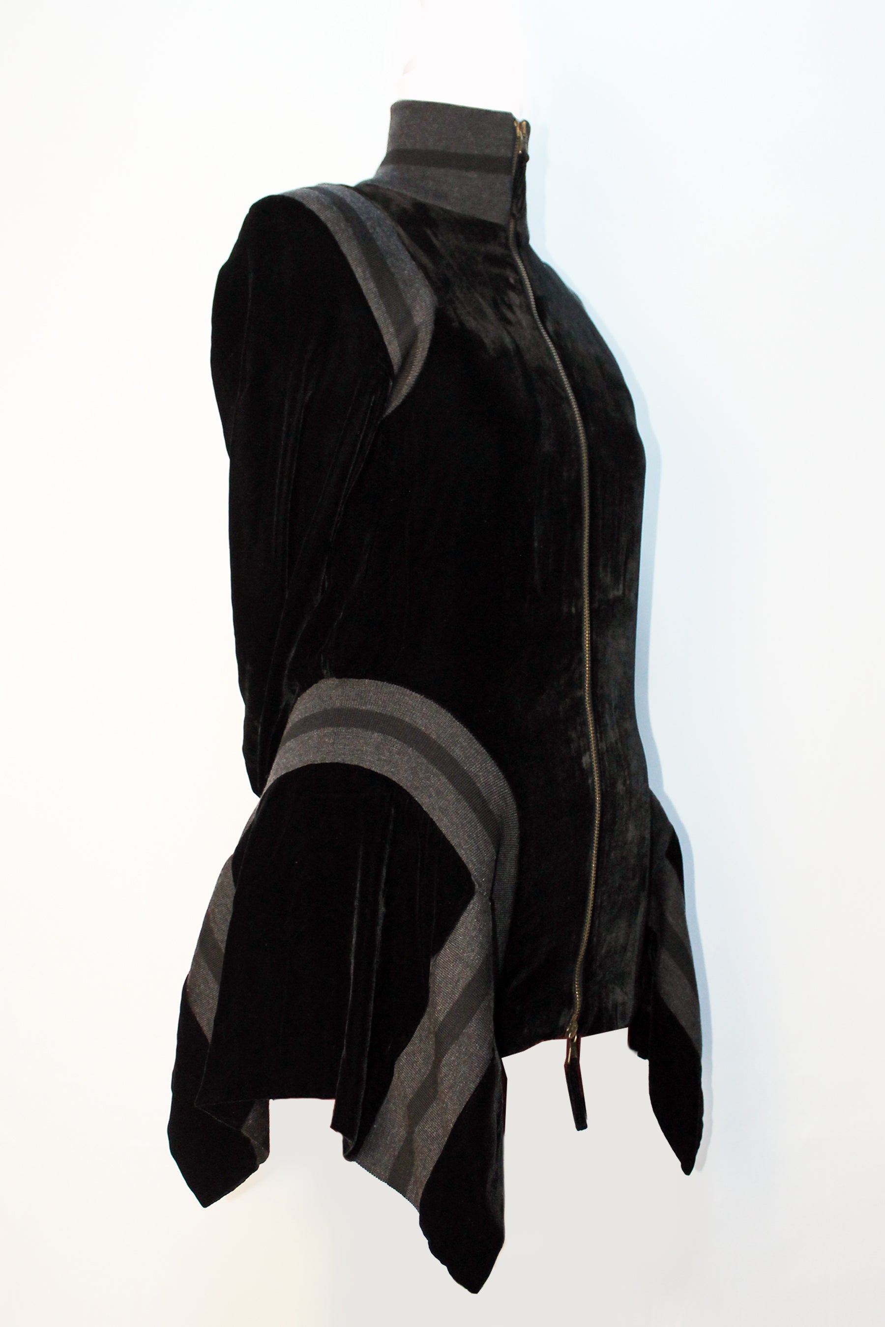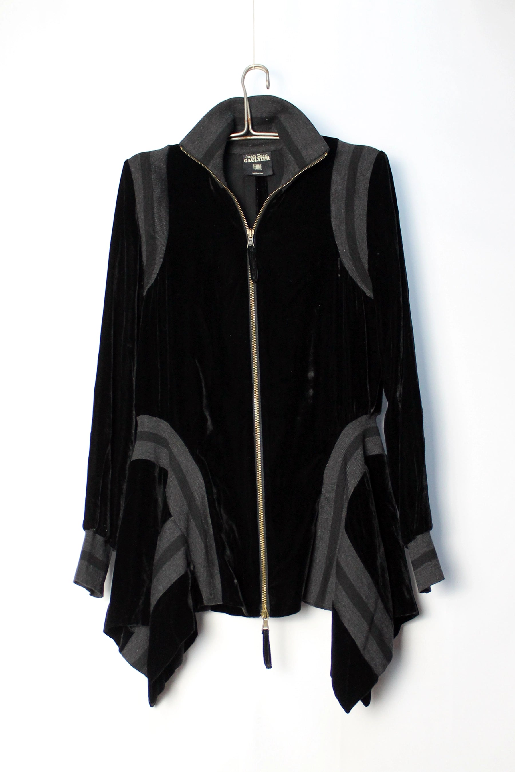 Molto raro, Felpa/blazer in velluto nero Jean Paul Gaultier, collezione Autunno/Inverno 2003. Caratterizzato da doppia zip, collo alto, silhouette a peplo con pannelli di diverse lunghezze e dettagli in maglia grigia su spalle, fianchi e polsi.