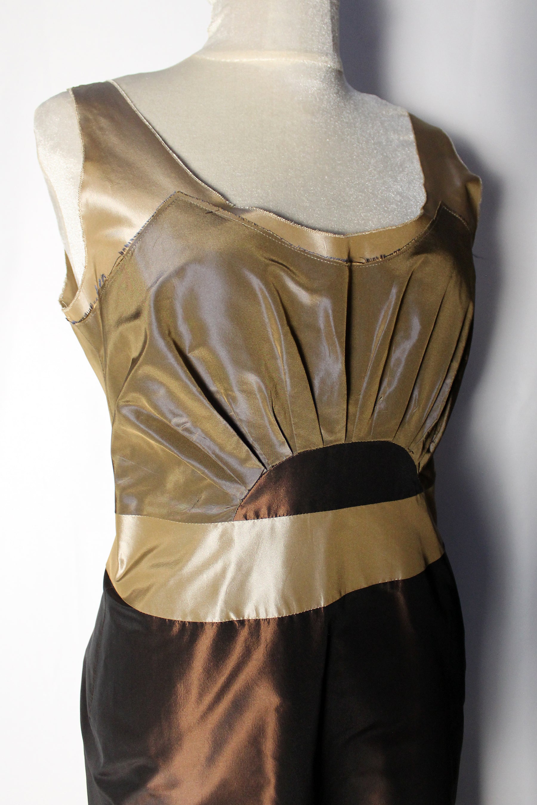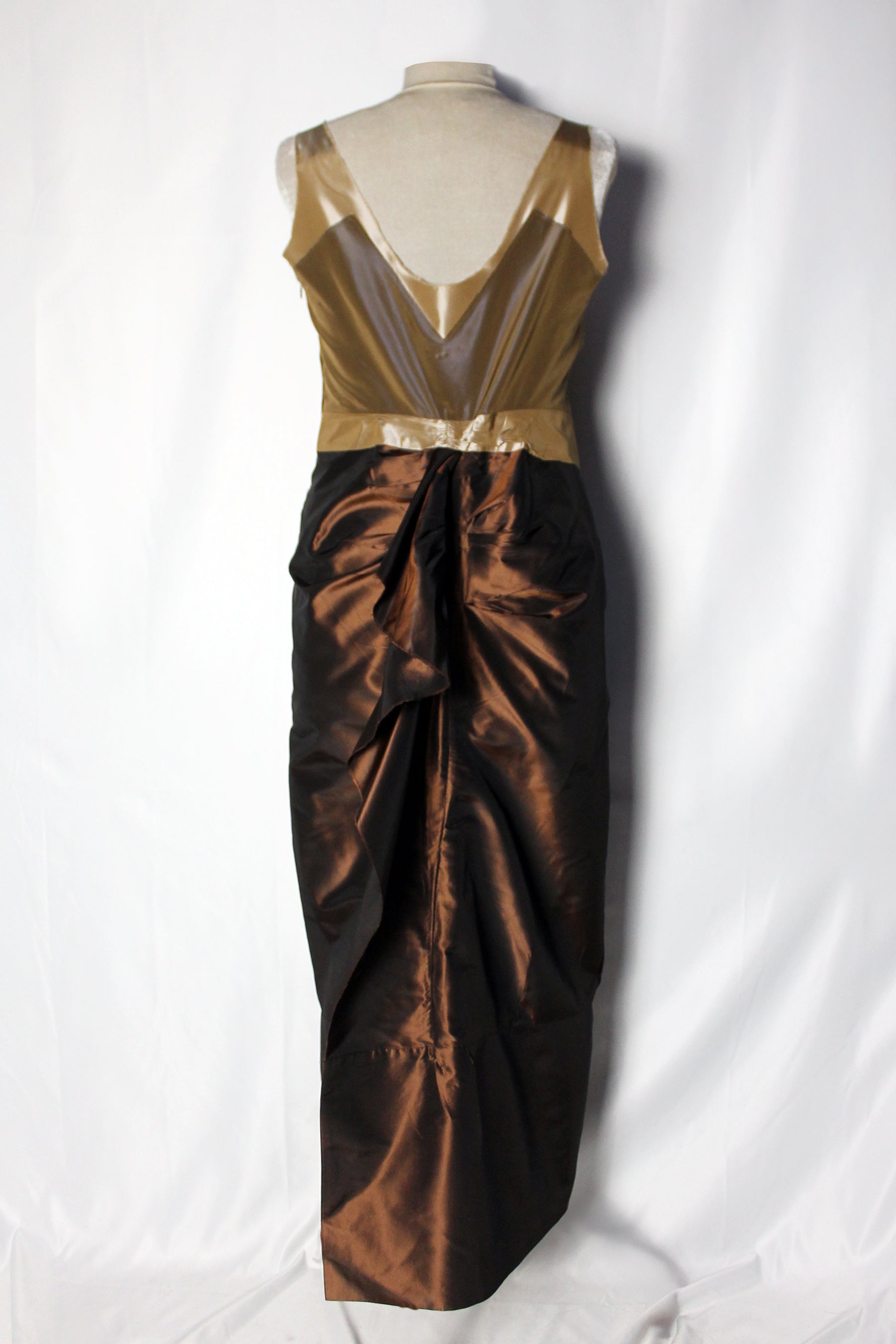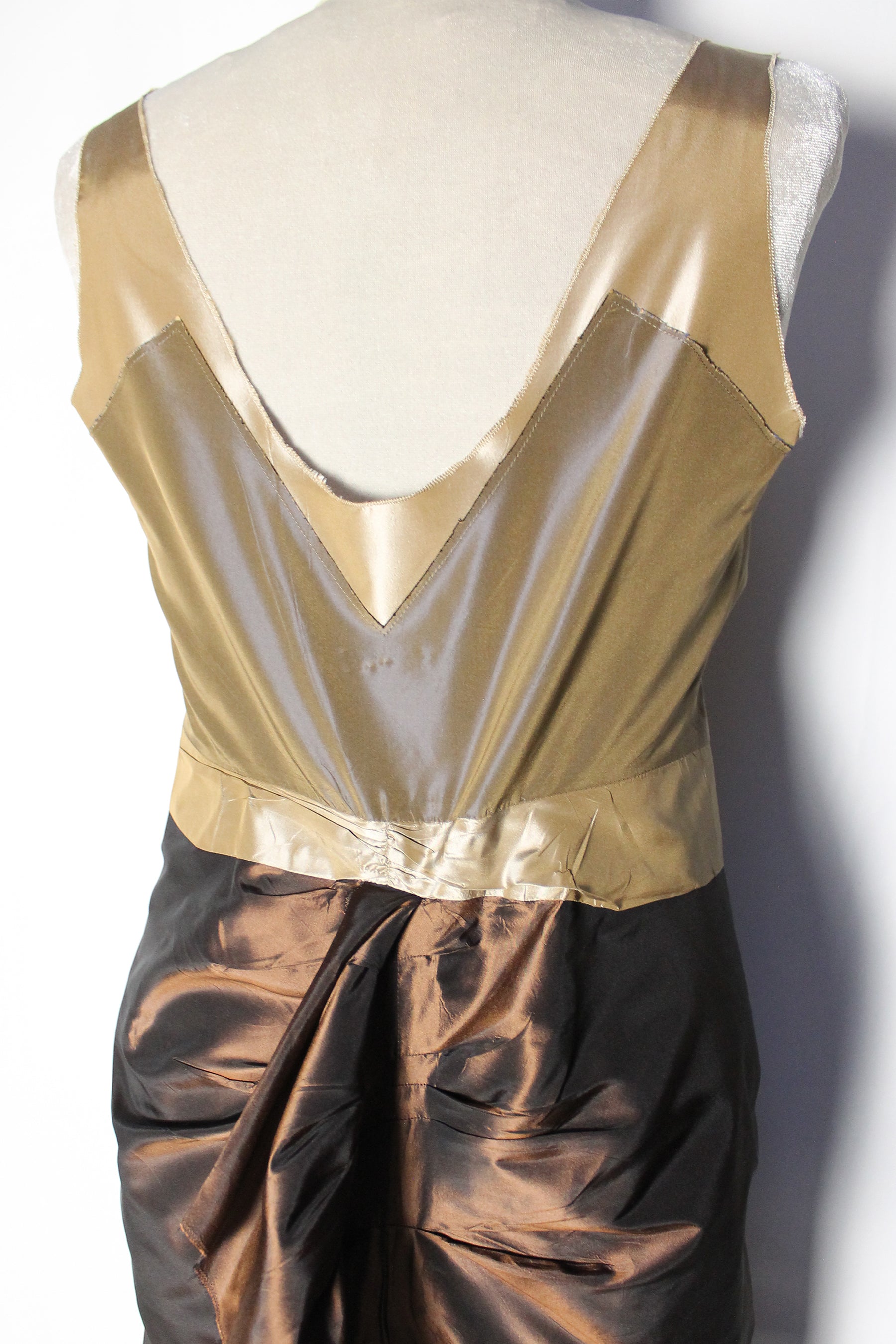 Dalla collezione fall/winter 2004 di Miu Miu, abito da sera vintage in seta cangiante sui toni del beige e del bronzo. Particolare il gioco di pieghe e sovrapposizioni di tessuto a taglio vivo. Il volant sul retro crea una coda scultorea.