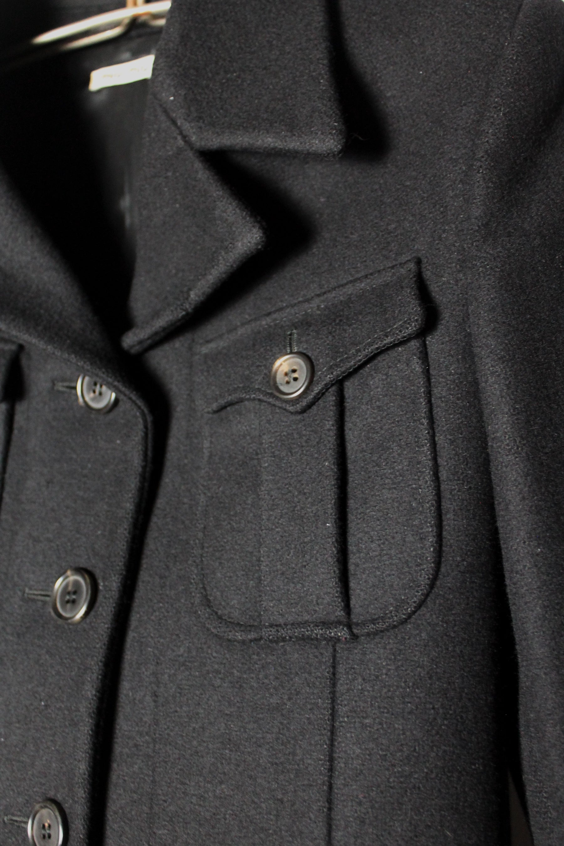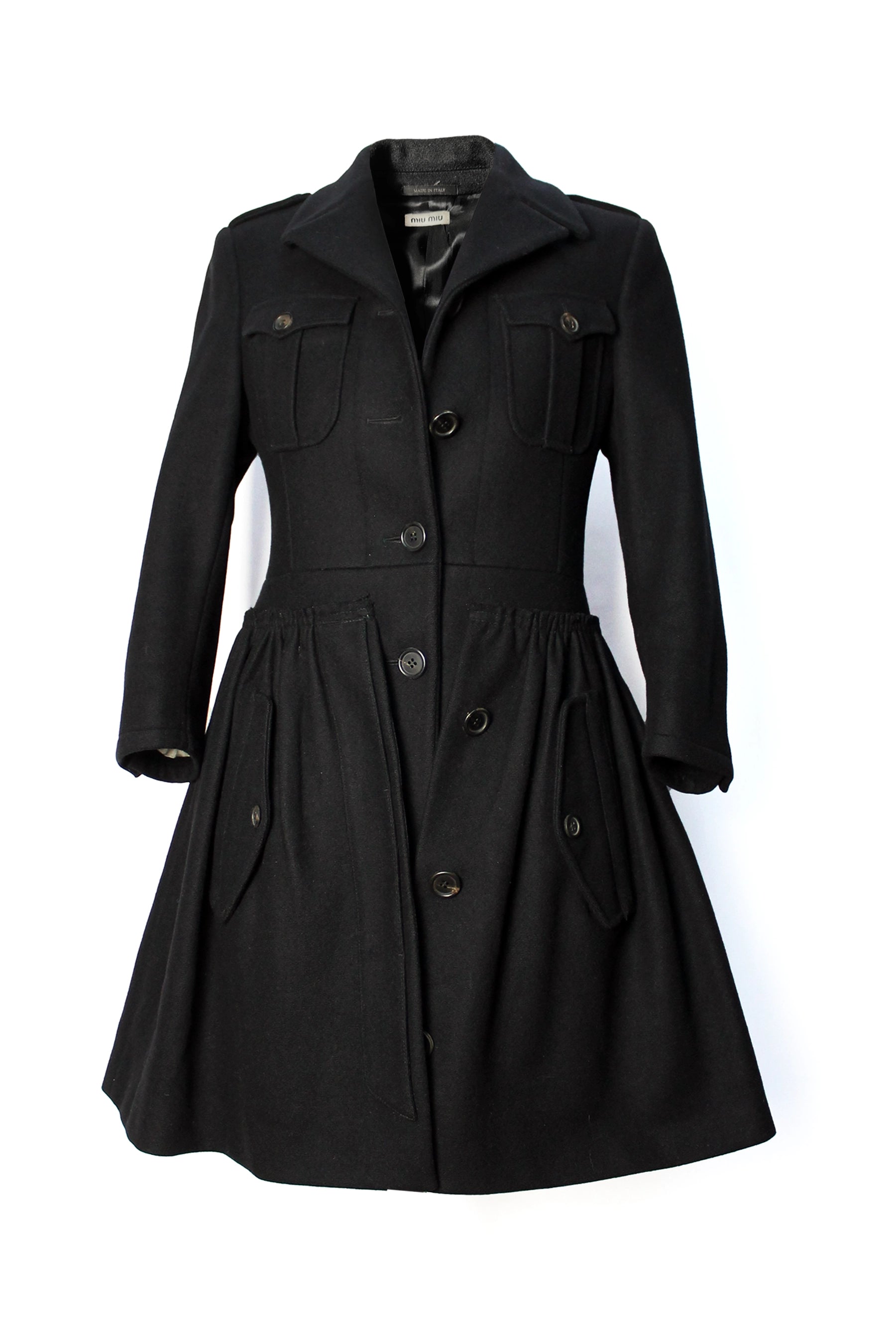Primo look della sfilata fall 2006 di Miu Miu. Cappotto nero in lana di ispirazione militare caratterizzato da colletto, rever classico, spalle leggermente imbottite, mostrine, polsini con tre bottoni sovrapposti, tasche a pattina chiusura frontale con bottoni, doppio strato plissettato stile gonna cucito in vita con tasche a pattina. Spacco posteriore chiuso da mostrina con bottone. Foderato.