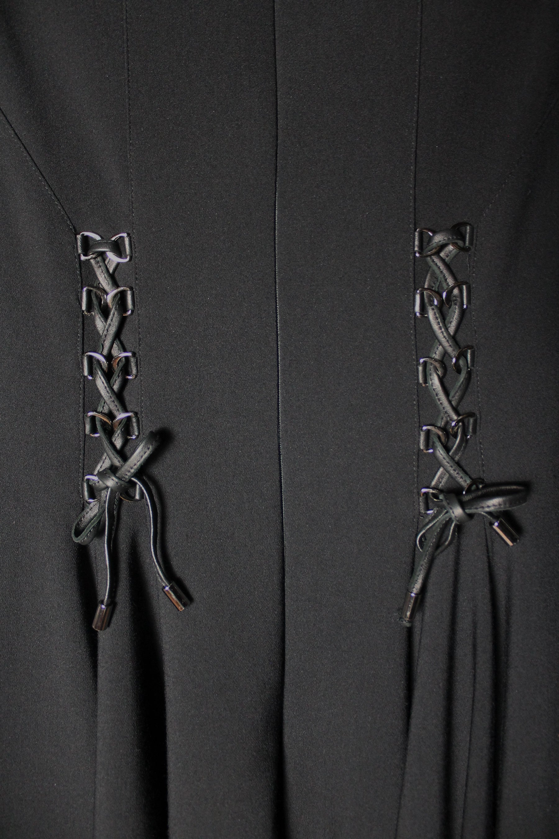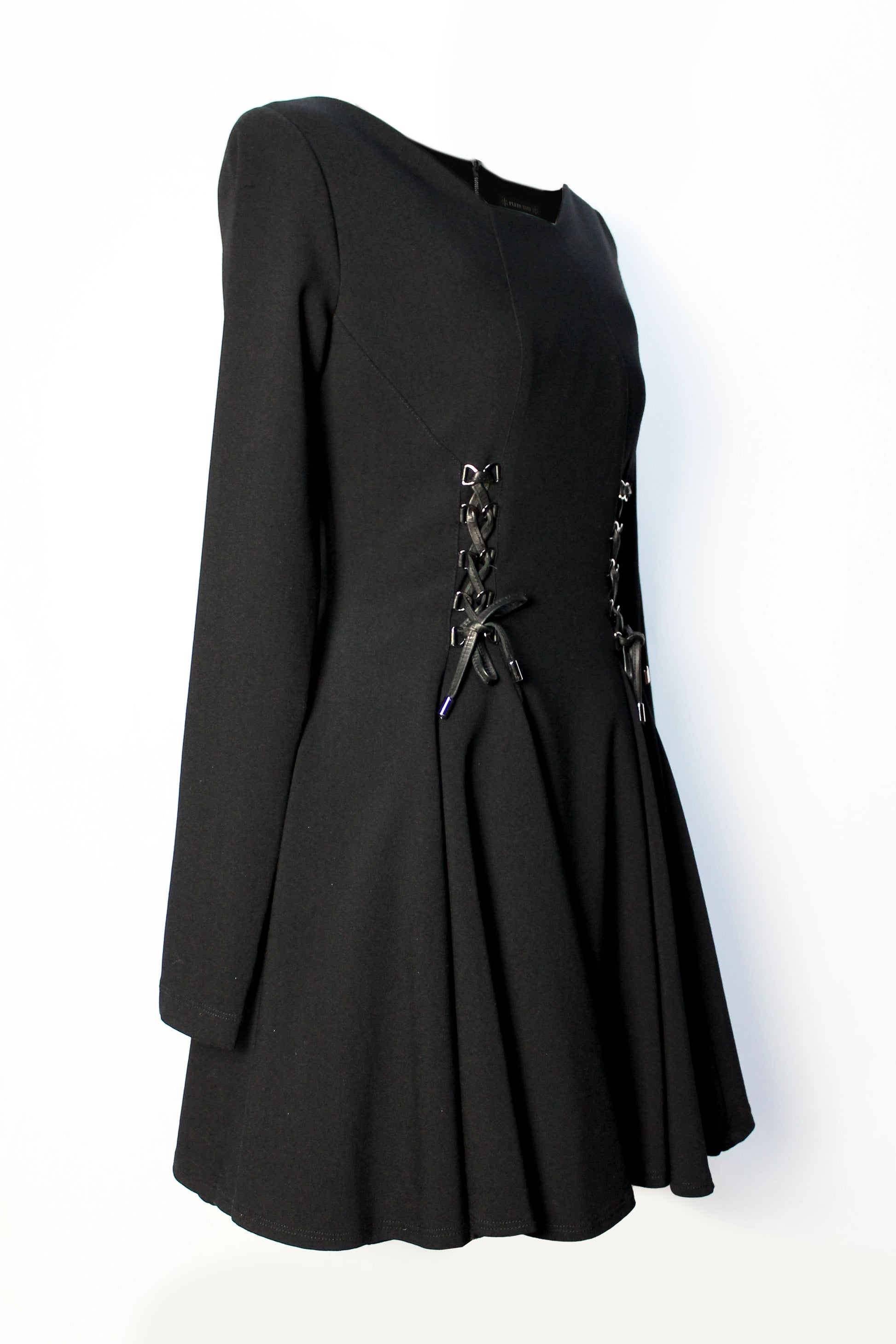 Mini abito con gonna a ruota in crepe di viscosa elasticizzata. Del brand Plein Sud fondato negli anni ’80 dal designer Fayçal Amor, noto per il suo stile sensuale, fluido e sofisticato, grande amico di John Galliano con il quale ha condiviso parte del suo percorso creativo alla fine degli anni 80. Con motivi effetto corsetto sia davanti che dietro, scollo geometrico e maniche lunghe.