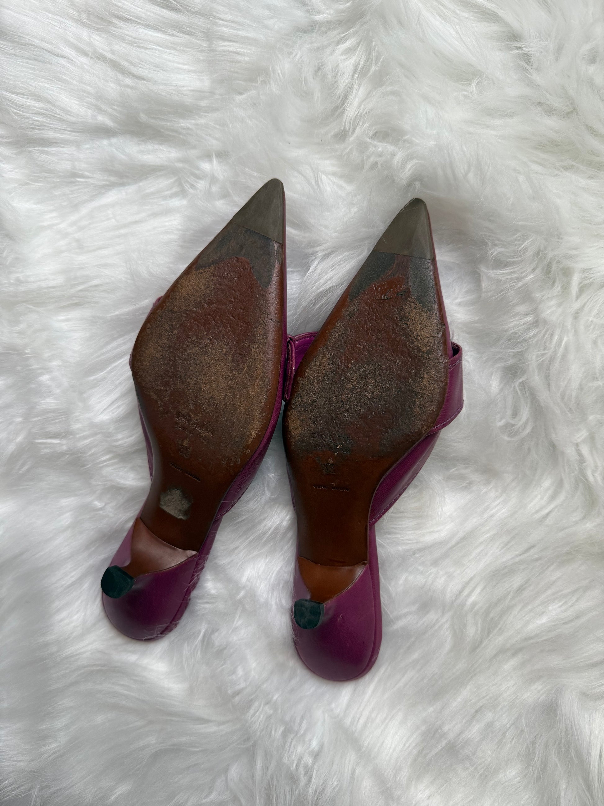 Prada, mule primavera estate 2002, iconiche con fibbia argento, in pelle color ciclamino, in ottime condizioni, rifatta puntina della suola e sottotacco nuovo.