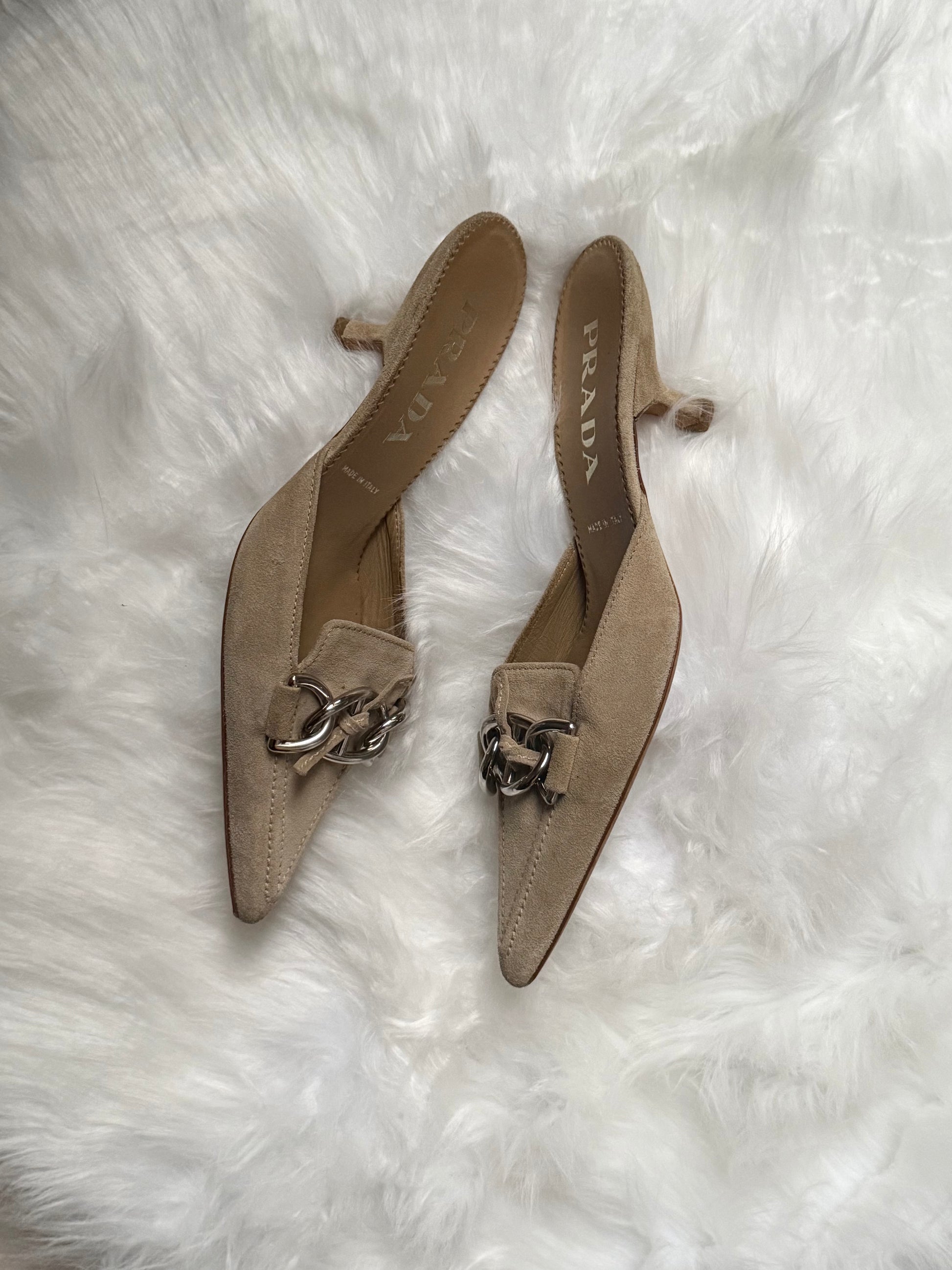 Prada anni 2000, splendide mule in pelle scamosciata beige sabbia con dettaglio a catena silver, kitten heel altezza 5 cm. Misura 37 italiana, in ottime condizioni, il sottotacco è appena stato sostituito.