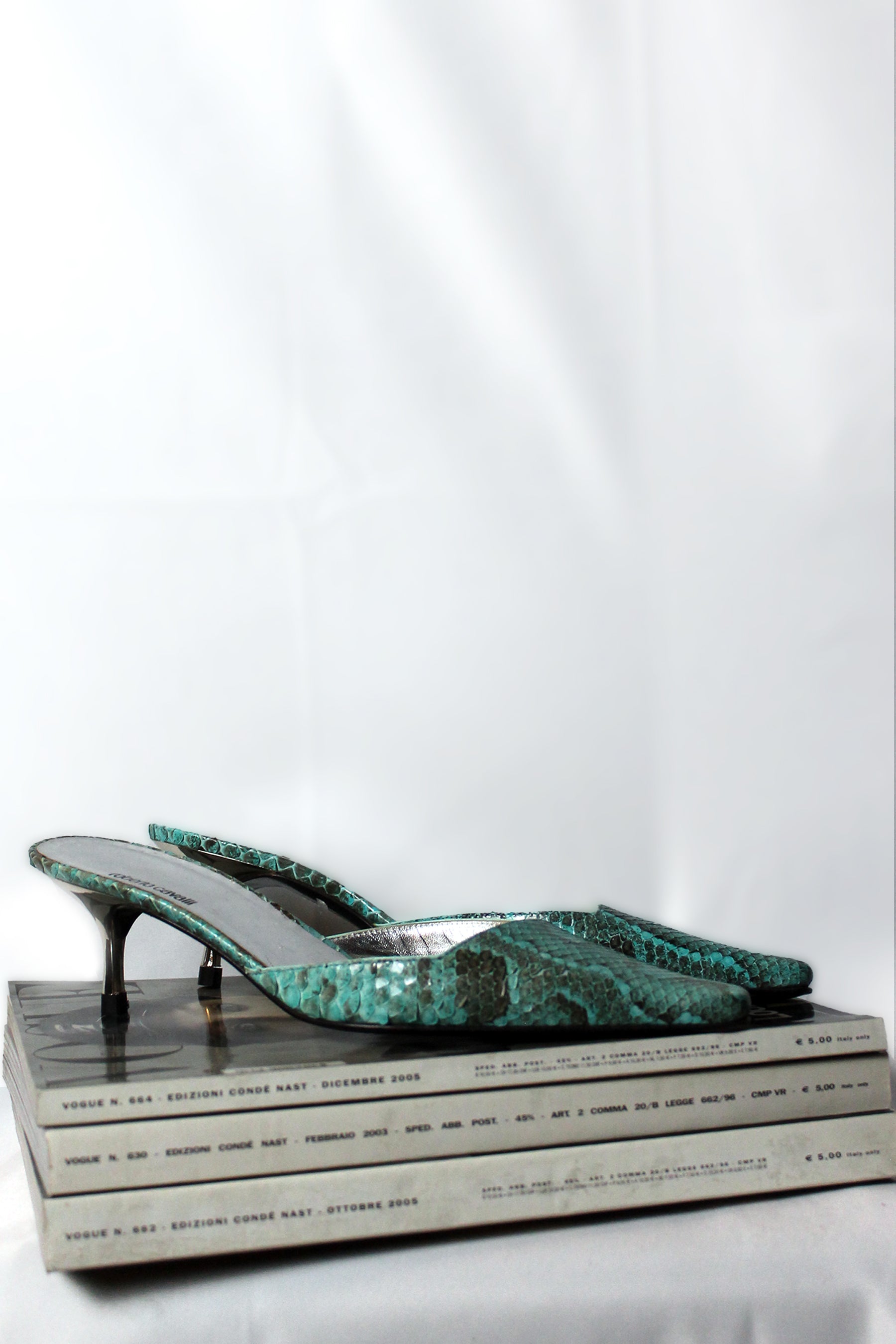 Sabot in pelle di pitone turchese con tacco kitten stile y2k, scollo asimmetrico e tacco argentato.