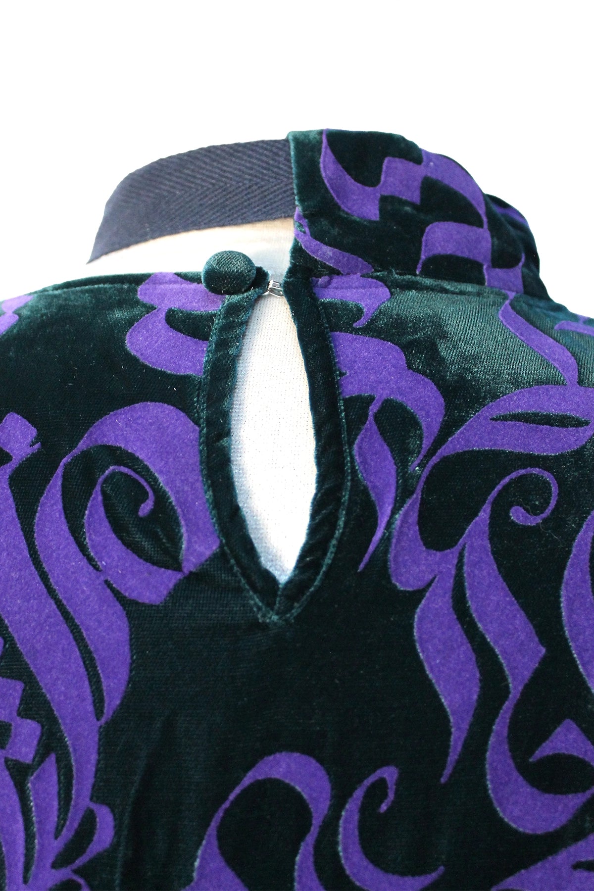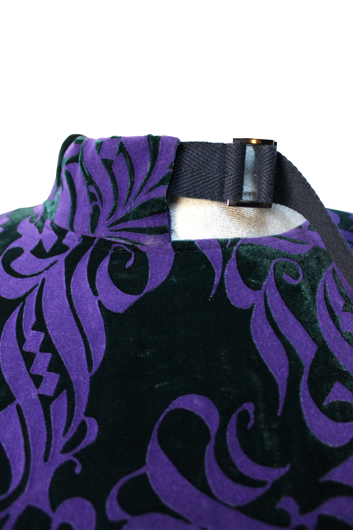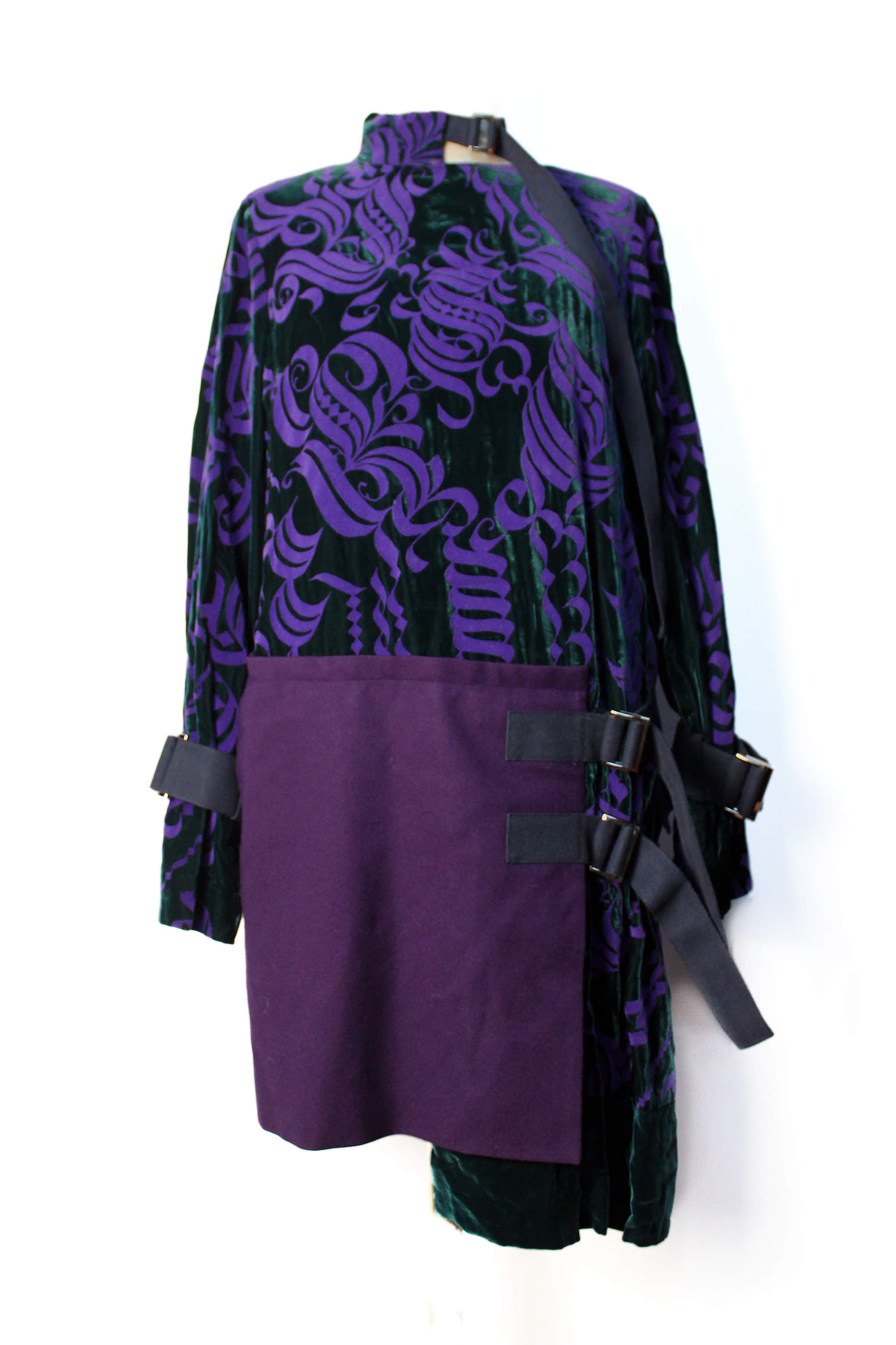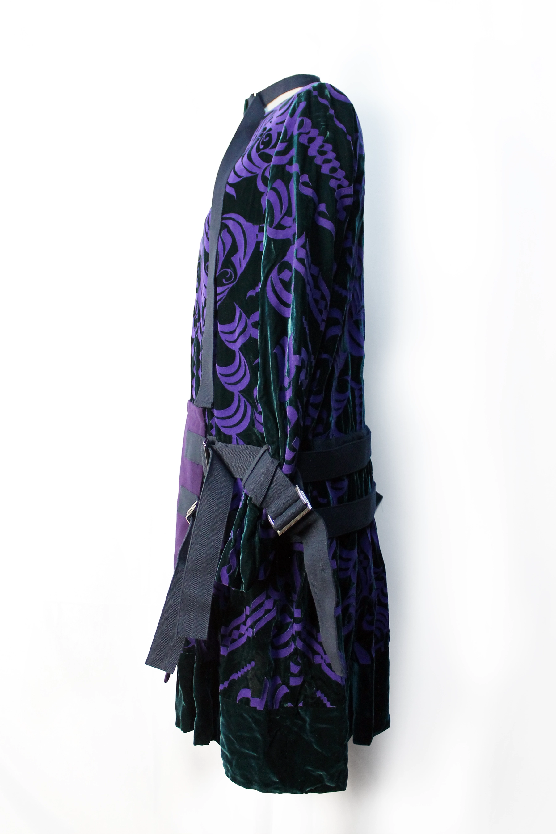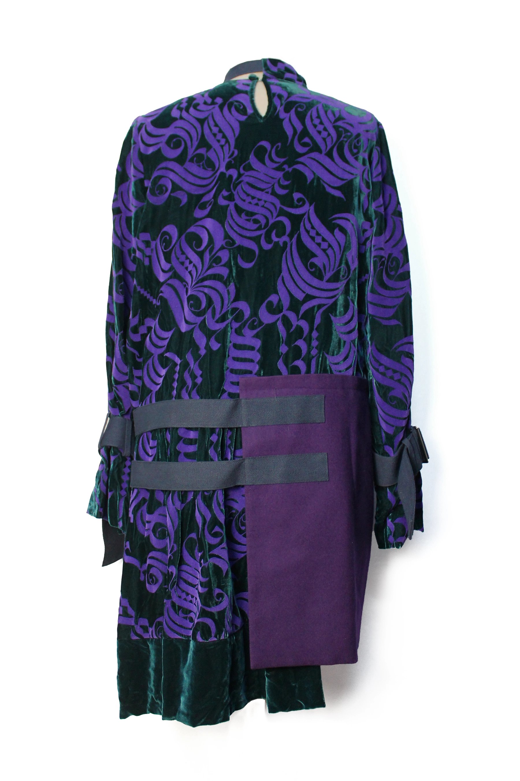 Particolarissimo abito destrutturato disegnato da Chitose Abe per la sfilata fall 2016. Dalla linea morbida e dritta, leggermente oversize. In velluto nero cangiante sul verde con stampa flock viola, la grafica è stata realizzata dall'artista giapponese Mikitype. Una gonna in panno di lana dotata di tasca è unita al vestito con delle cinghie in cotone. Le cinghie sono presenti anche sulle maniche e sul collo. L'abito è foderato.