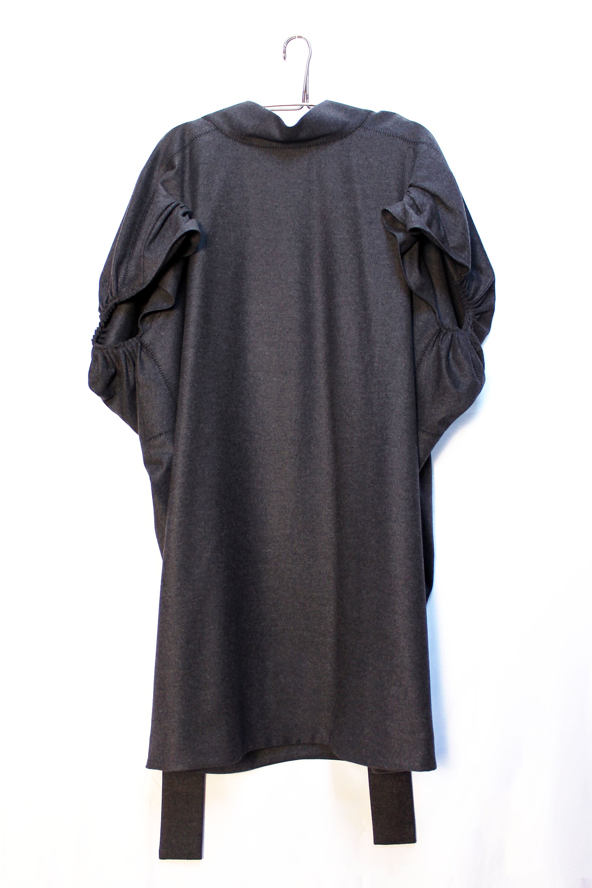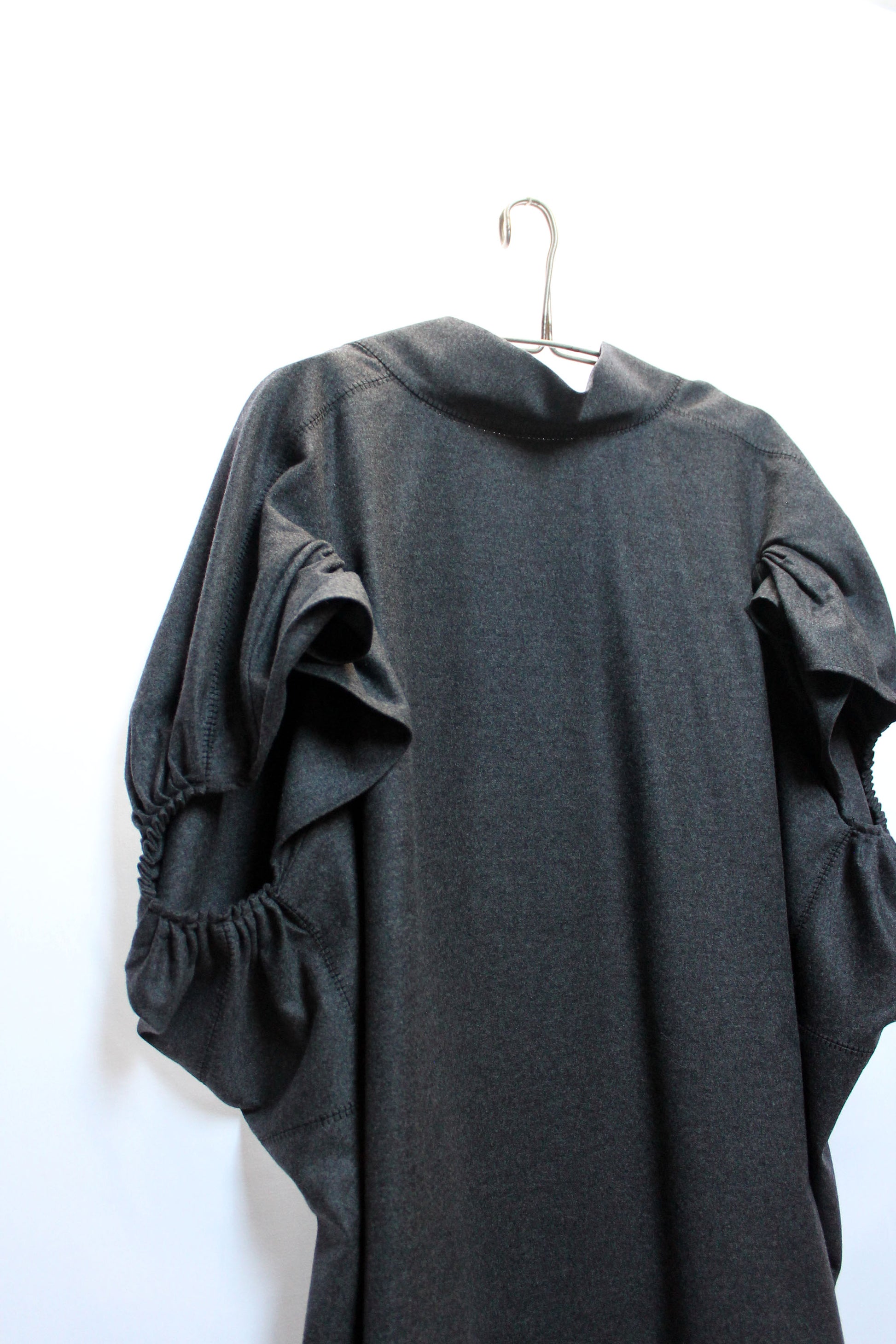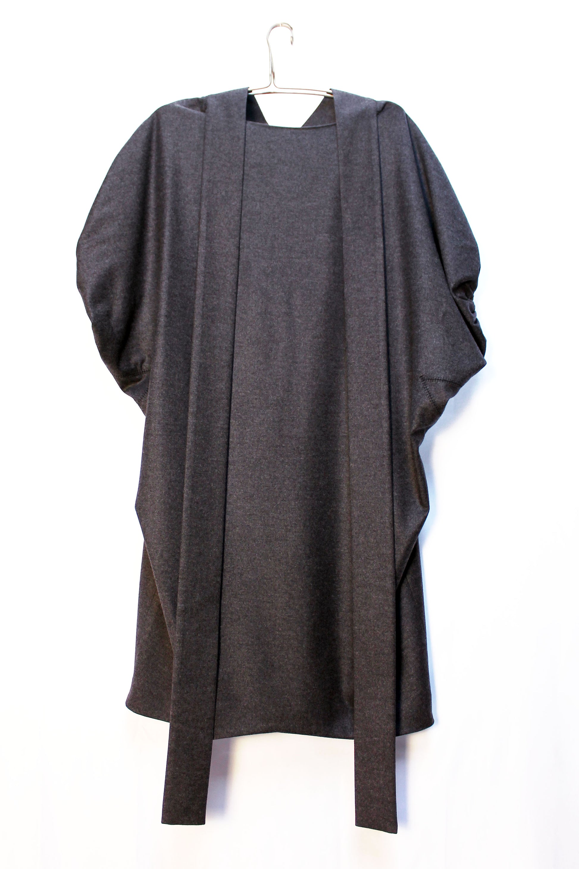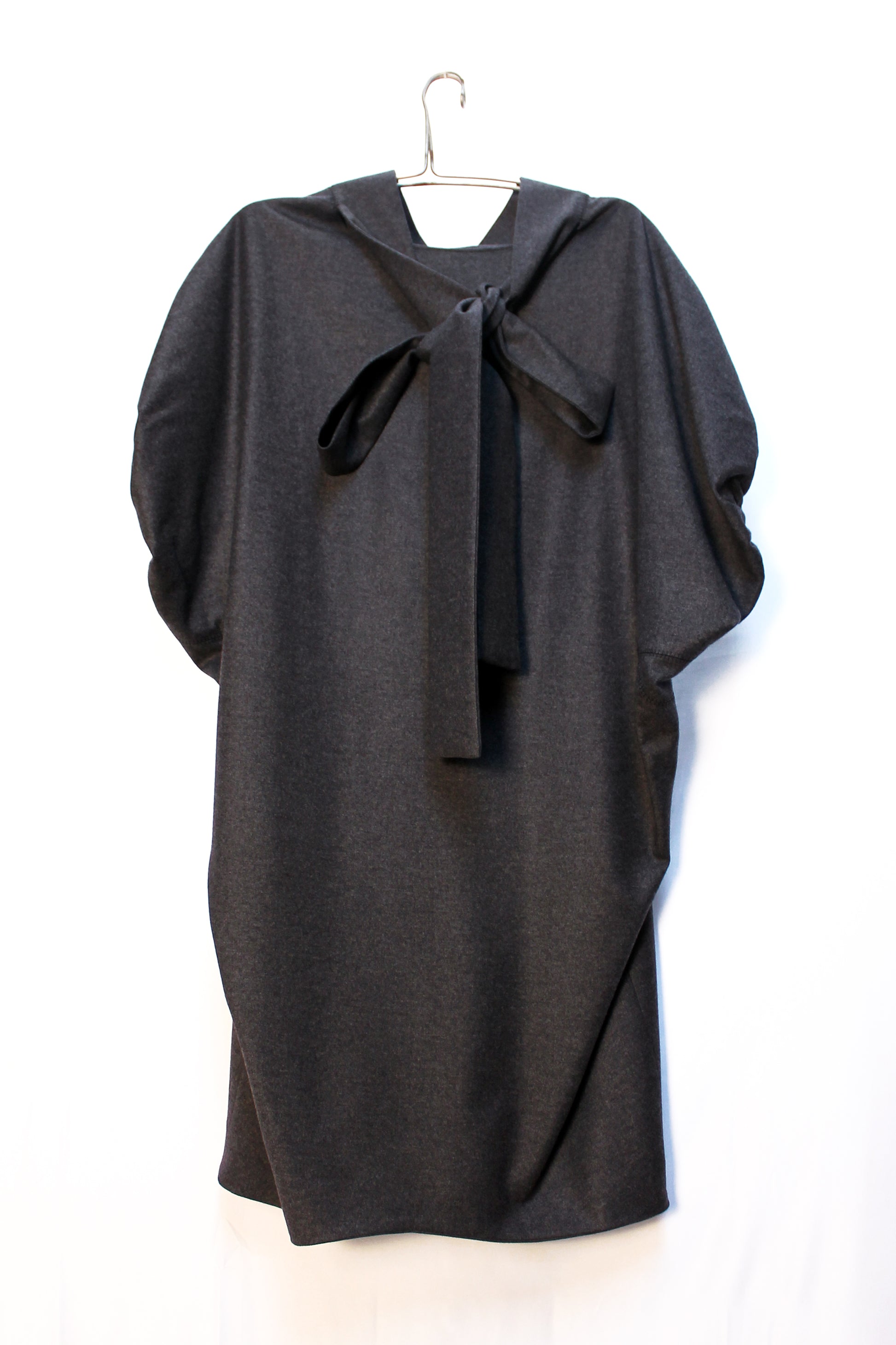 Dalla sfilata fall winter 2007 di Stefano Pilati per Yves Saint Laurent, abito box oversize con maniche a sbuffo in morbido panno misto lana e cachemire. Colletto alto con fascia posteriore da annodare. La vestibilità è ampia.